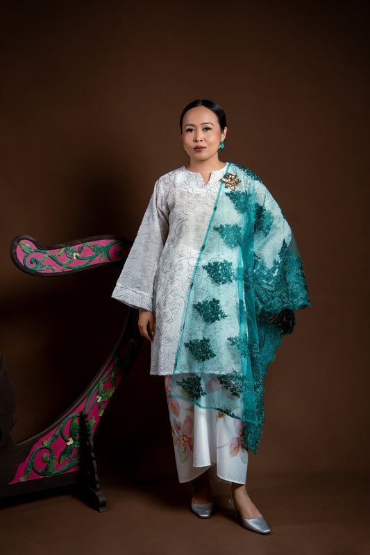 Selendang Rindu Lapis Bunga Putih Mekar