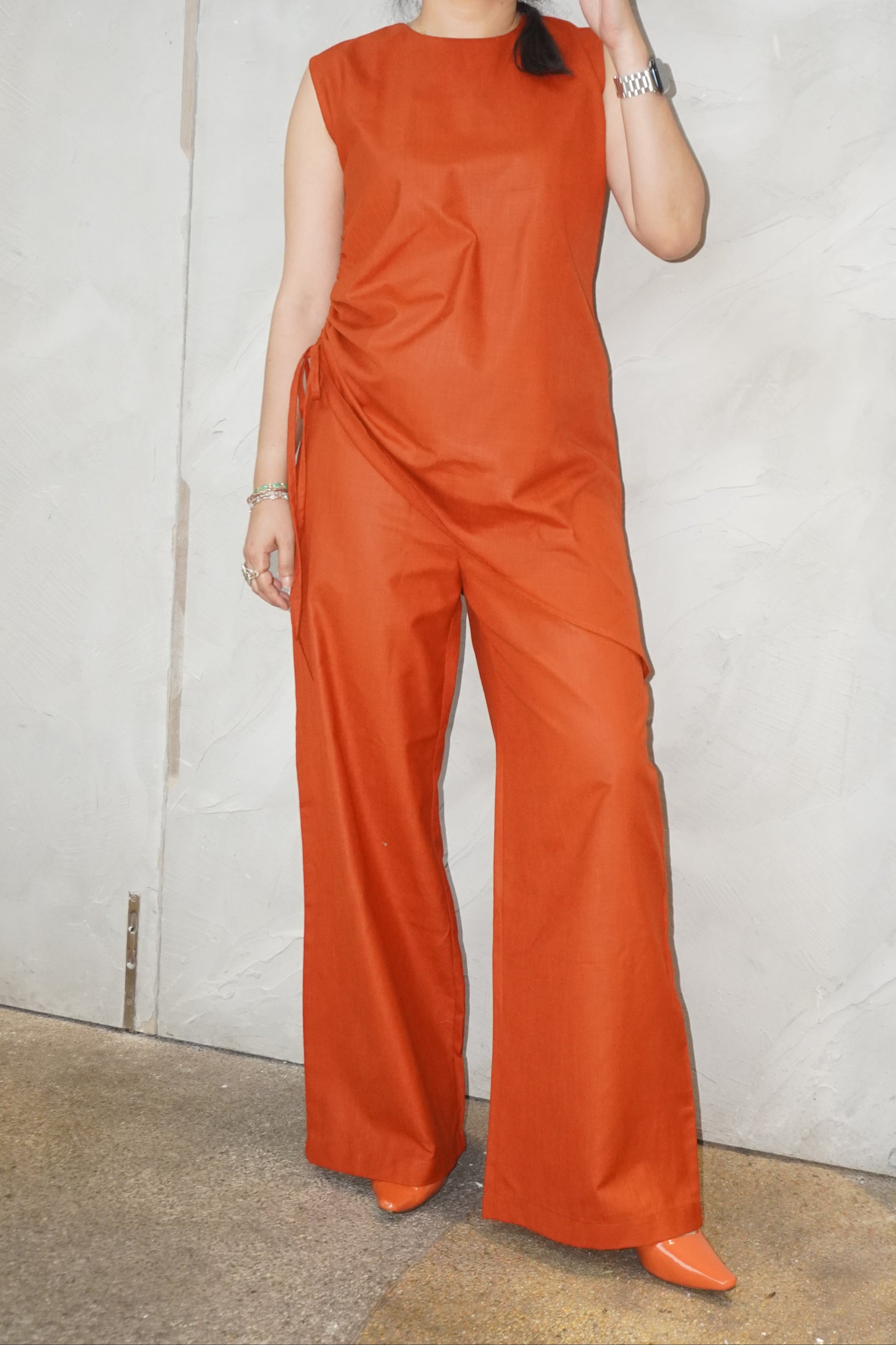 Diperbuat daripada linen ringan yang sejuk dipakai, set ini menampilkan atasan dengan tali serut di sisi yang boleh dilaras mengikut gaya. Dipadankan dengan seluar linen senada.