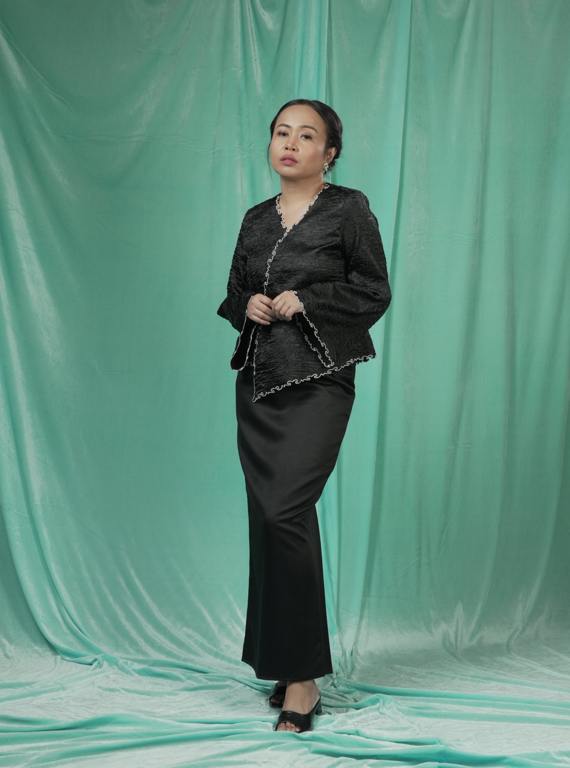 A short kebaya with a unique asymmetrical front, delicate embroidery, and flared sleeves— versatile for casual and formal wear.