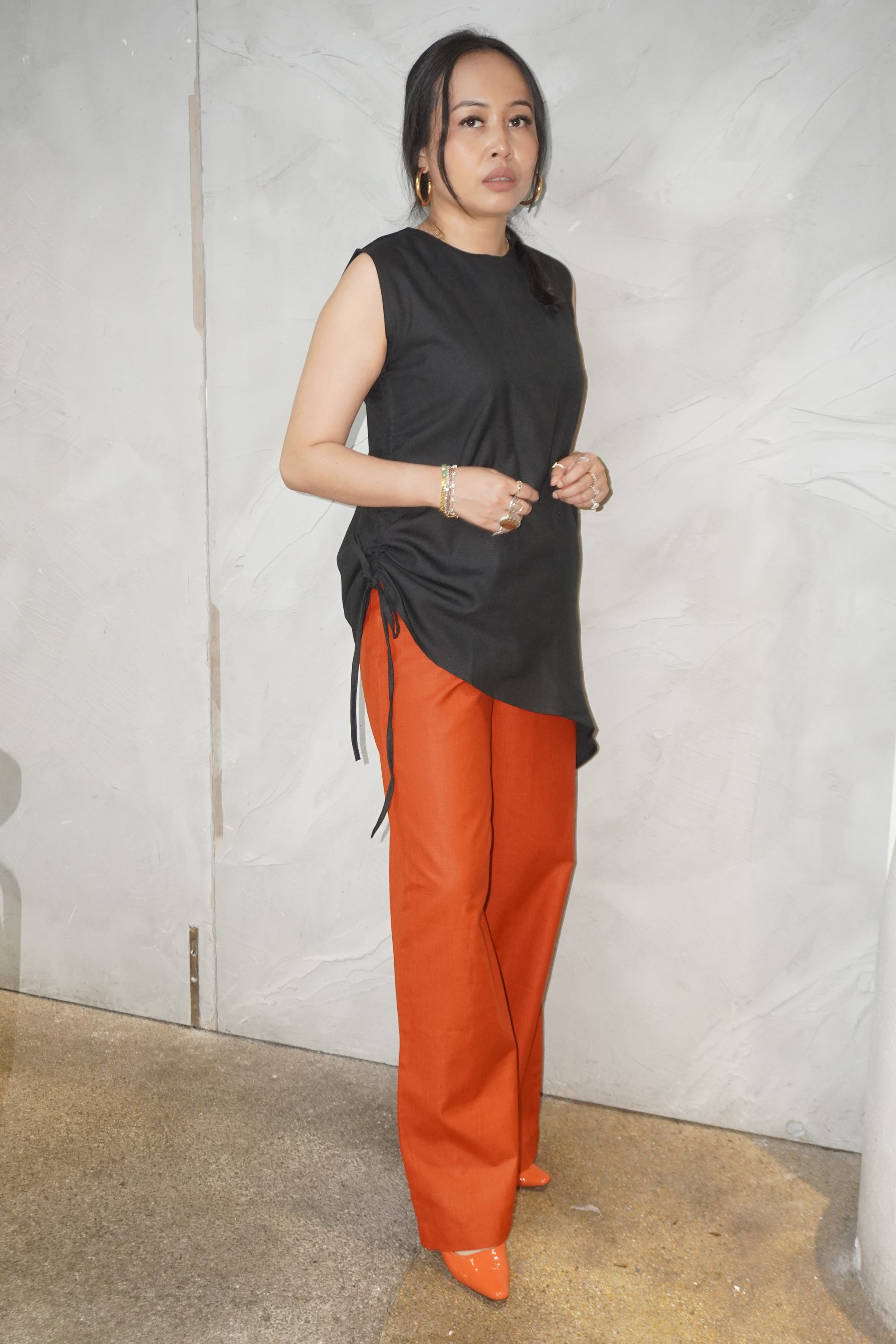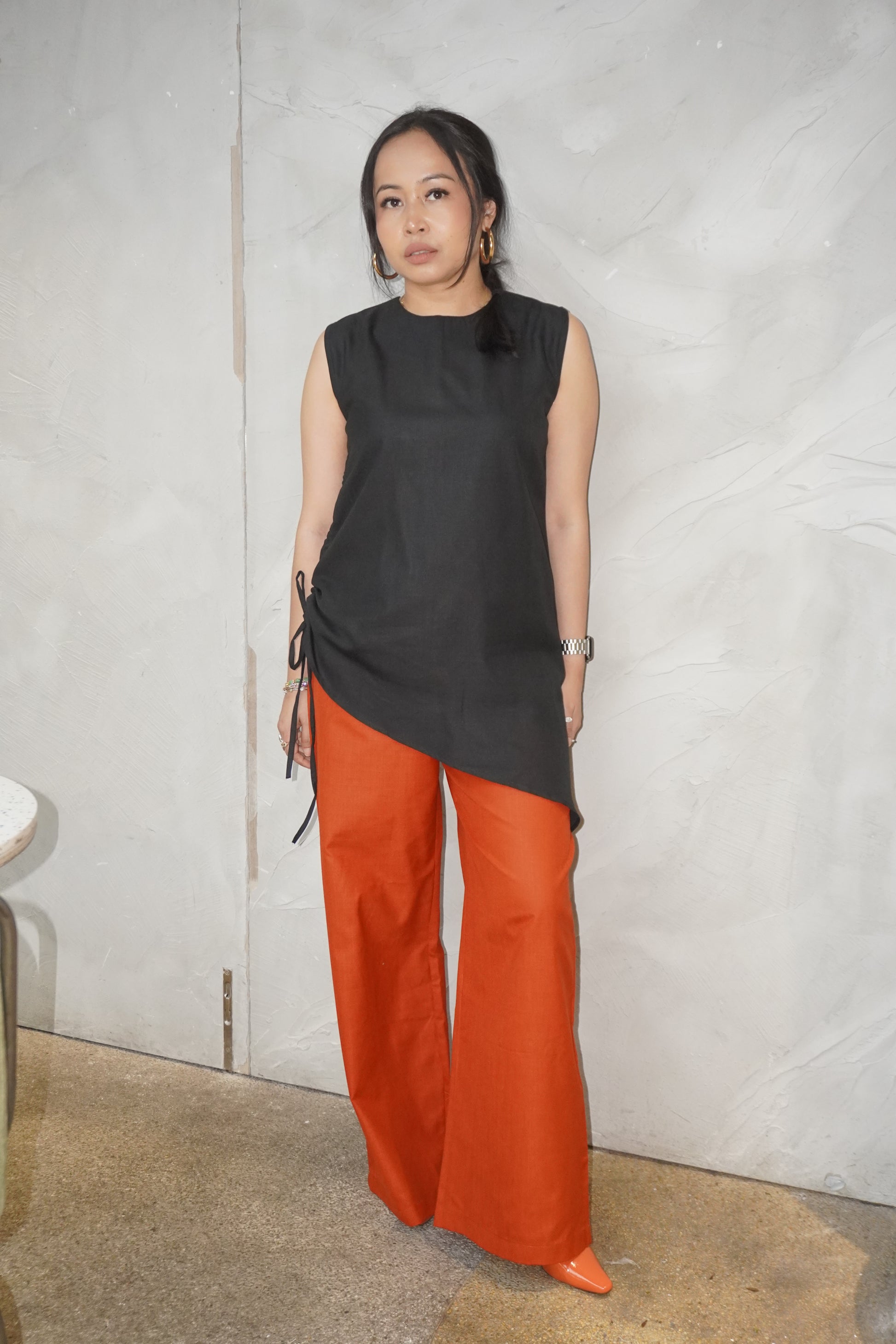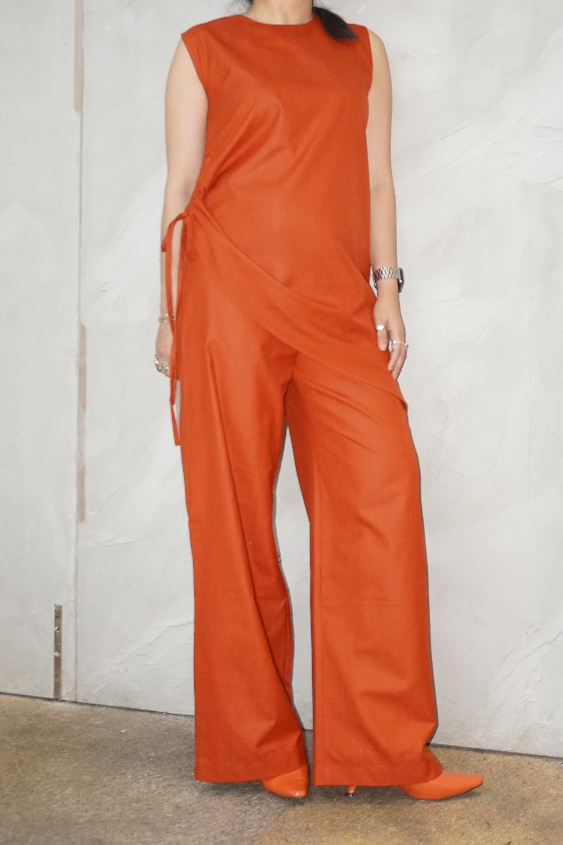 Diperbuat daripada linen ringan yang sejuk dipakai, set ini menampilkan atasan dengan tali serut di sisi yang boleh dilaras mengikut gaya. Dipadankan dengan seluar linen senada.